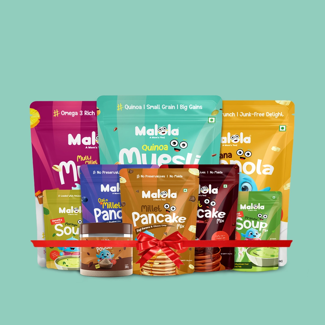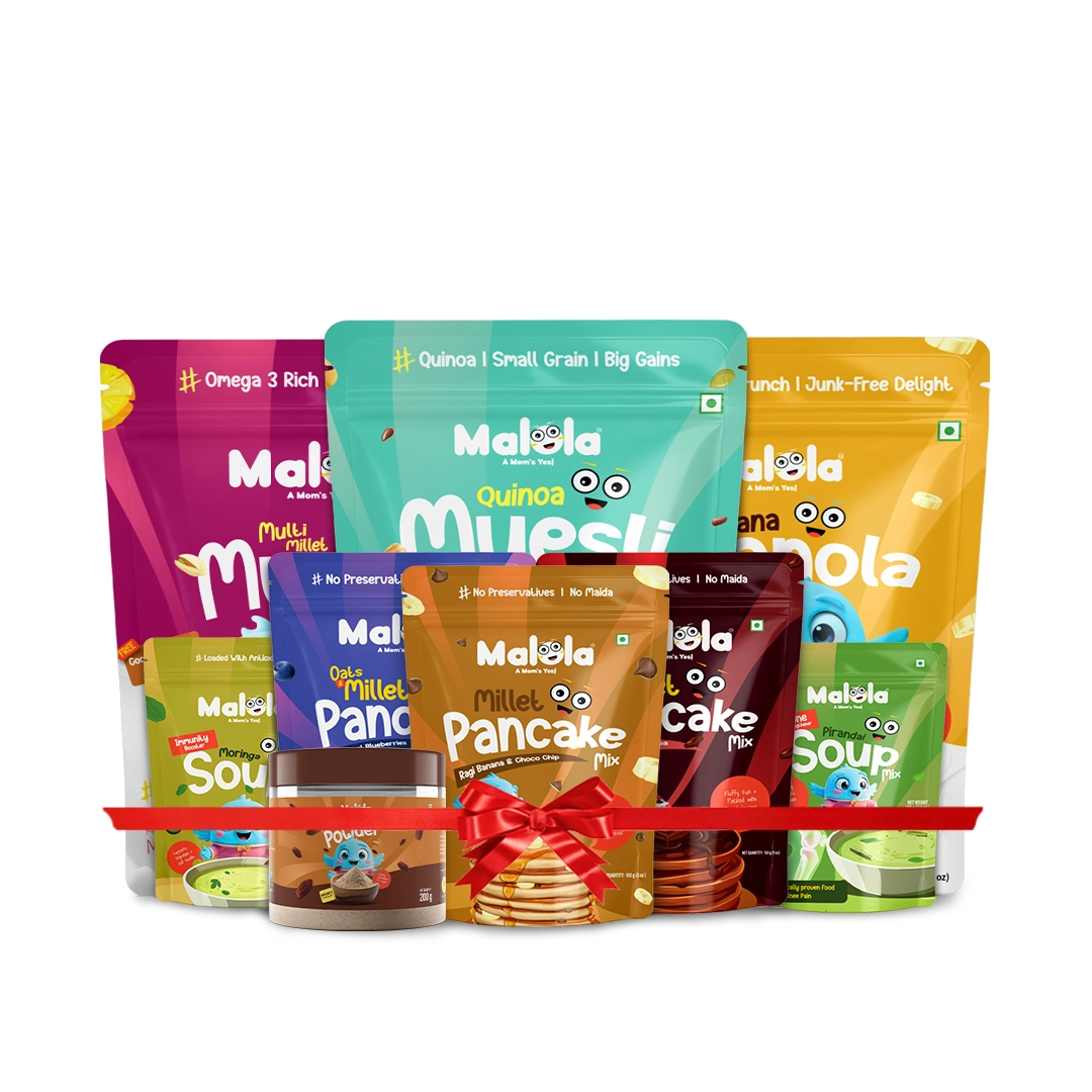 Enjoy the ultimate wholesome experience with the Health Harvest Box — a rich collection of Fruit & Nut Muesli, Quinoa Muesli, Banana Granola, Moringa Soup, Pirandai Soup, Blueberry Pancake, Ragi Banana Pancake, Choco Pancake, and Dates Powder. Packed with energy, nutrients, and natural goodness, it’s perfect for fueling your body and mind all day long.